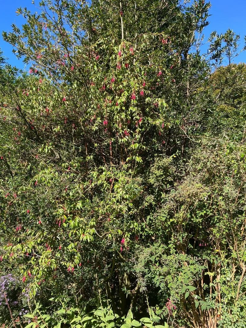 The climbing fuschia, F. regia sub serrae from Brazil, is a sight at the moment clambering high into the crinodendron in the lower garden. It was not meant to be very hardy but has survived several winters.