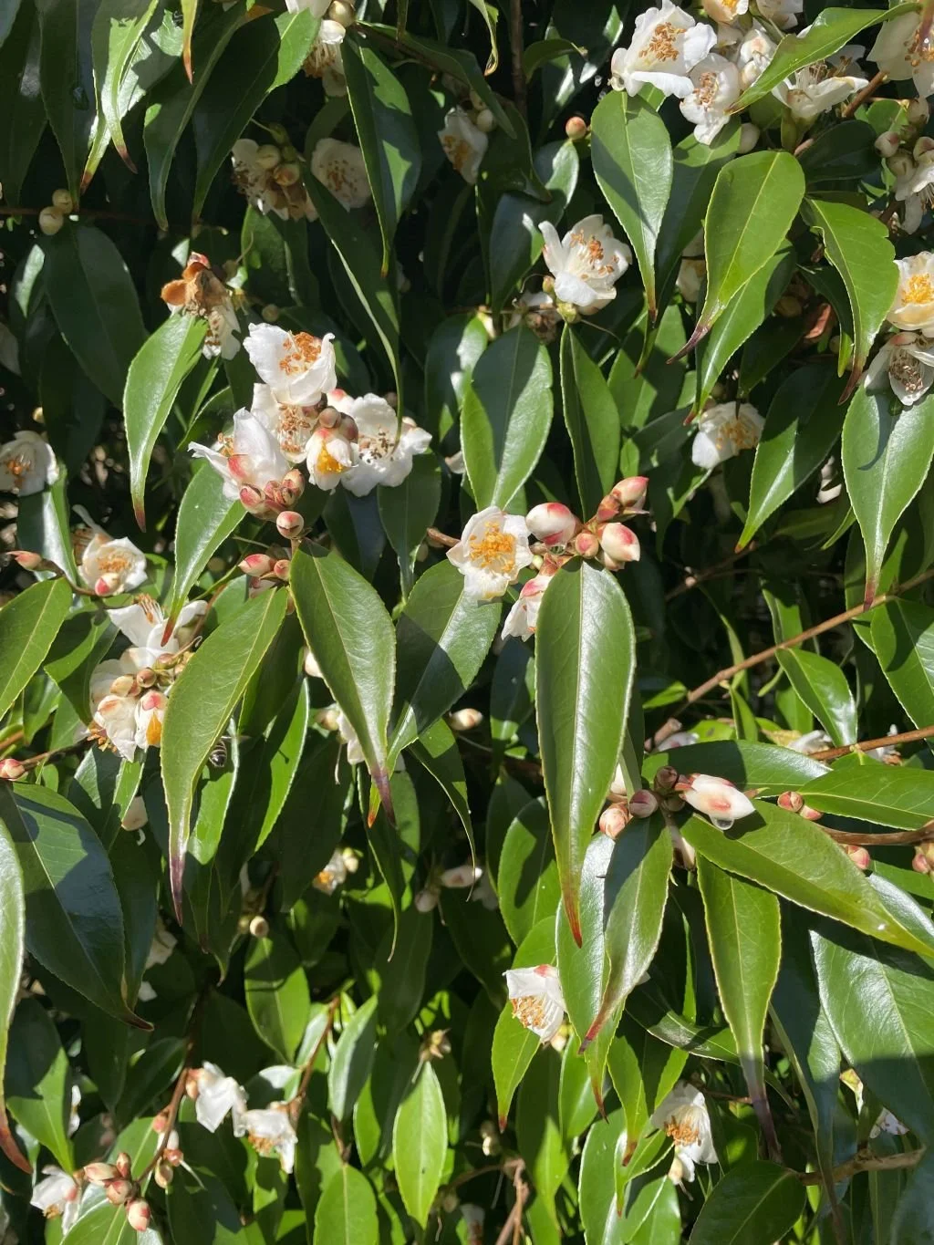 here, camellia cuspidata, which is also flowering now, tiny white flowers